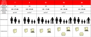 Pour les enfants de 5 à 12 ans, le coefficient est de 50 W. Lors du calcul du gain de chaleur total lors de l'installation d'un climatiseur dans une maison, une moyenne de 110 W est prise, qui est multipliée par le nombre de membres de la famille.