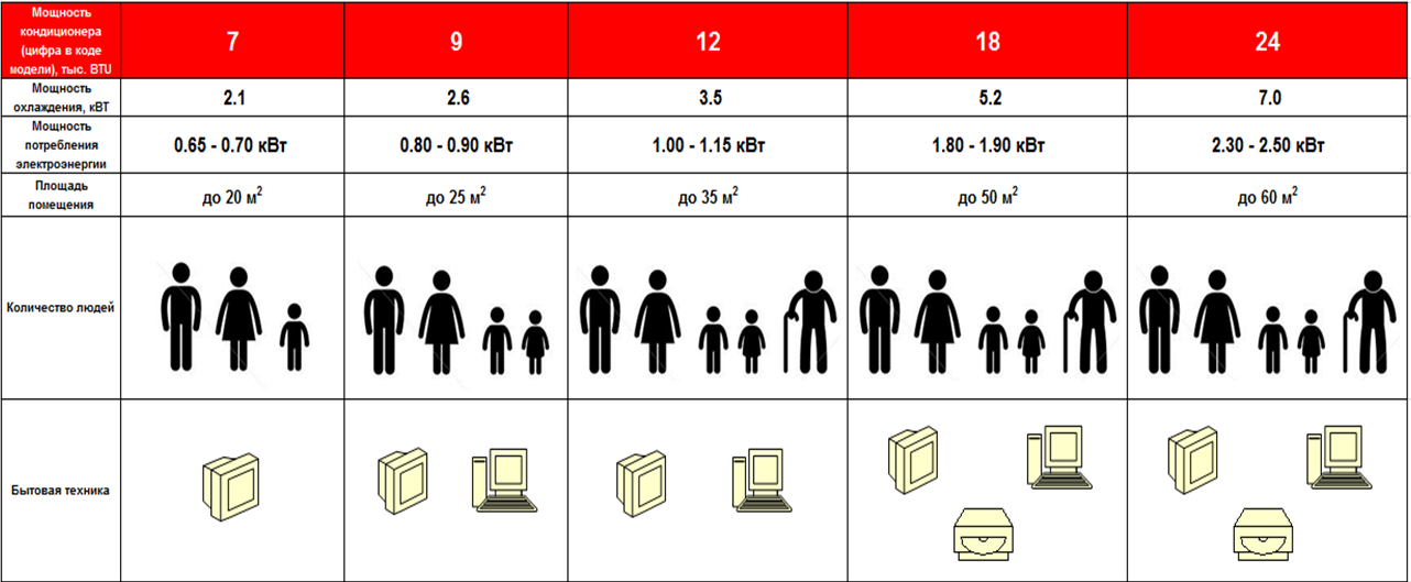 La capacité de refroidissement est indiquée par des chiffres ronds : 5000 BTU, 7000 BTU, 9000 BTU à 30 000 BTU. Dans le marquage des modèles, simplement le chiffre 5 "cinq", 7 "sept", 9 "neuf" sont indiqués. Pour un calcul préliminaire du système de division par la surface de la pièce, la puissance en BTU est multipliée par 3.