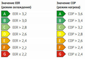 Le rapport entre la consommation d'énergie et la capacité de refroidissement est le principal indicateur de l'efficacité énergétique de la technologie climatique. Il est désigné par le ratio EER. Dans les appareils ménagers, sa valeur est de 2,5-4. Pour le chauffage, une formule et un COP similaires sont dérivés. Ses paramètres sont de l'ordre de 2,8-5.