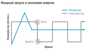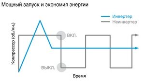 Contrairement aux modèles conventionnels, les climatiseurs Inverter sont plus sensibles aux fluctuations de température. Au moindre changement d'indicateurs, une commande est automatiquement donnée pour corriger la puissance de travail. Avec un tel système, l'équipement est constamment en fonctionnement. Mais en ajustant la puissance, des économies d'énergie sont réalisées.