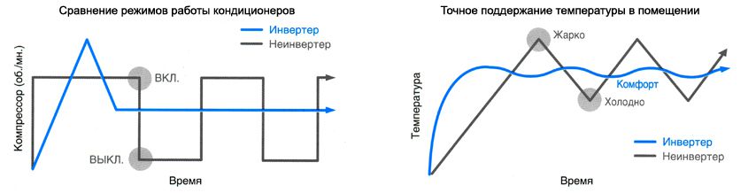 Plus la vitesse du compresseur est faible, plus la consommation d'énergie est faible. De tels climatiseurs économes en énergie ont le plus souvent un moyen d'inverser de contrôler le fonctionnement du compresseur, lorsque le mode d'économie d'énergie est automatiquement activé lorsque les valeurs de température définies sont atteintes.