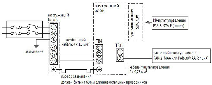 Il convient de garder à l'esprit que les schémas de câblage pour la connexion du climatiseur pour les modèles domestiques de faible puissance et les modèles semi-industriels (commerciaux) plus puissants sont différents. Les premiers sont monophasés et les seconds sont à la fois monophasés et triphasés.