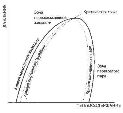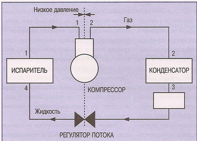 Dans presque tous les SCR, le schéma de circuit est identique. Le cycle de refroidissement peut également être représenté graphiquement, comme le montre la figure. Ici, la partie gauche de la courbe est l'état du liquide saturé, la droite est l'état de la vapeur saturée. Au point de jonction, le fréon peut être dans n'importe quel état.