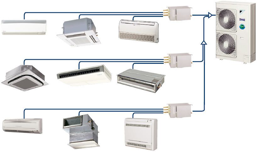 Il existe des systèmes multizones qui fonctionnent avec un seul type d'unité intérieure - par exemple, murale, c'est-à-dire que tous les modules intérieurs doivent être exclusivement du même type. Mais les fabricants modernes produisent des systèmes de climatisation multi-split avec la possibilité de connecter différents types d'unités intérieures à une unité extérieure, tandis que pour les bâtiments qui ont un grand nombre de pièces avec différentes charges thermiques, les systèmes multizones avec un débit de réfrigérant variable ont été créé depuis plusieurs années.Ils ont une unité externe capable de fournir des dizaines d'unités internes.