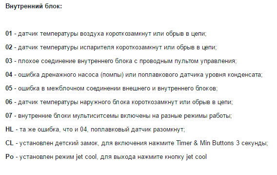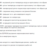 Par exemple, si le climatiseur s'éteint et que la diode clignote toutes les trois secondes pendant huit fois, il est nécessaire de vérifier le fonctionnement du moteur du ventilateur. Les informations sur les défauts simplifient grandement la réparation et, surtout, protègent l'ensemble du système des dommages graves qui pourraient survenir si le climatiseur fonctionnait avec des dysfonctionnements, signalés par des codes d'erreur pour les climatiseurs lji.