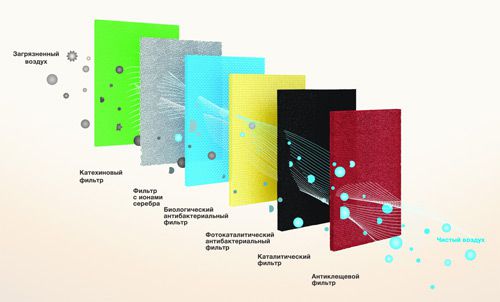 Le système de filtration est équipé de 6 filtres distincts, dont anti-acarien, antibactérien biologique, catéchine (excellent désodorisant anti-allergène) et aux ions d'argent. Tous tuent les bactéries et les virus, rendant l'air sain et propre, mais ils ont parfois besoin d'entretien (nettoyage).