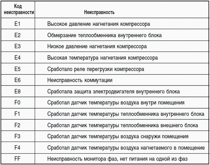 Les cas nécessitant des diagnostics et même des réparations incluent l'apparition de certains codes sur le panneau de commande - ce sont les codes dits d'erreur fournis par le fabricant pour l'autodiagnostic en cas de dysfonctionnement. Chaque caractère alphanumérique représente un problème spécifique. Par exemple, lorsque F3 est mis en surbrillance, le capteur de température de la rue s'est probablement éteint, E1 indique une augmentation de la pression dans le compresseur et FF indique une alimentation électrique incorrecte.