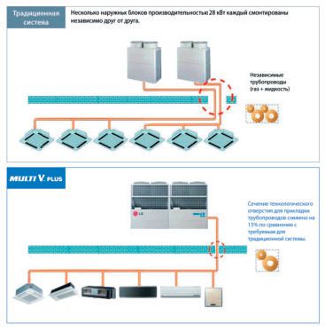 Un avantage significatif est un réseau unique de canalisations de fréon, ce qui simplifie l'installation et réduit considérablement la consommation d'énergie. La longueur accrue du parcours jusqu'à 200 m avec des dénivelés jusqu'à 100 m permet l'installation d'éléments du système sans tenir compte de l'emplacement d'un module particulier.