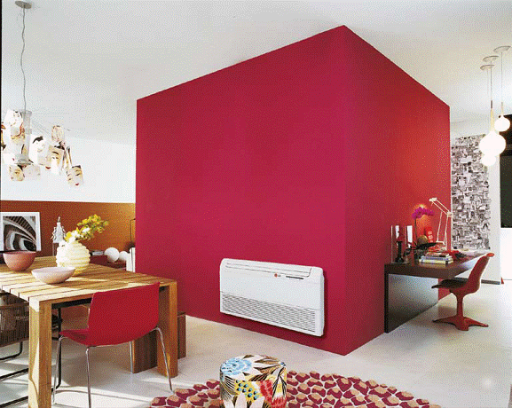 Les modules intérieurs des climatiseurs LG, de type sol-plafond, sont installés avec succès à la fois au mur près du sol et au plafond. L'unité extérieure y est reliée au moyen d'un rail en cuivre dans un radiateur. Pour les modèles à faible puissance, l'alimentation va de l'interne vers l'externe, tandis que pour les autres c'est l'inverse. LG produit à la fois des climatiseurs à onduleur et des climatiseurs standard de ce type. Les valeurs de surface des pièces peuvent varier de 25 à 280 m².