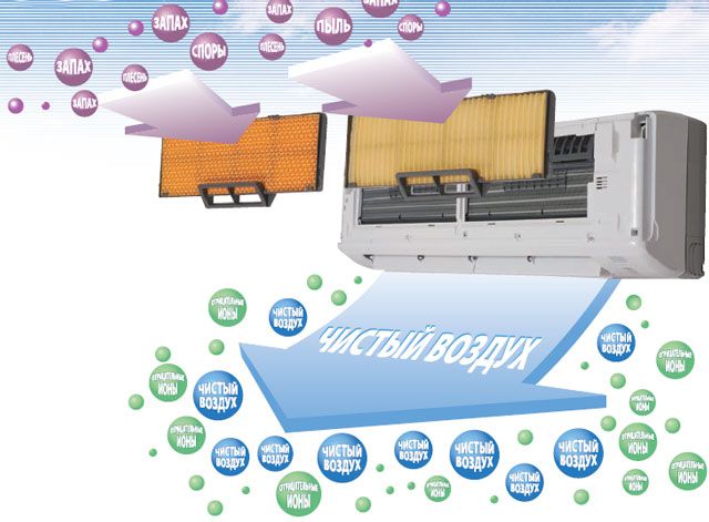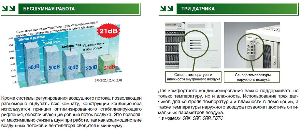 - une variété de modes et de fonctions intégrés - maintien automatique de la température, redémarrage après des dysfonctionnements, fonctionnement du système de sauvegarde, possibilité de changer la direction des flux d'air dans les plans horizontaux et verticaux;