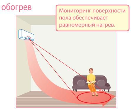 La distribution la plus douce et la plus uniforme des masses d'air est assurée par un climatiseur sol-plafond, qui dirige leurs flux vers le haut, où ils divergent dans toute la pièce. Cette technologie élimine l'apparition de courants d'air.
