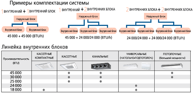 Les systèmes multi-split modernes ont les mêmes caractéristiques que les unités à deux composants : efficacité énergétique, faible bruit, haute efficacité, compacité, une longue ligne de fréon et des différences de hauteur admissibles de plusieurs dizaines de mètres. Ils travaillent sur des marques modernes de fréon, qui ne contiennent pas de chlore.