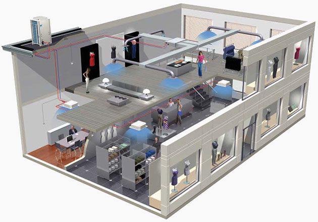 Tout type de climatiseur est utilisé, en fonction du nombre d'étages du bâtiment et de ses caractéristiques architecturales. Si le bâtiment est d'un étage, un toit-terrasse ou un monobloc est installé.
