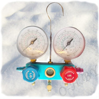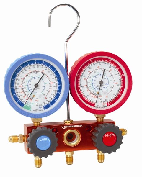 - Equipé de 2 robinets, 2 manomètres et trois tuyaux. Ce sont des instruments à deux valves qui peuvent mesurer la pression dans deux directions. Le manomètre rouge mesure la pression de refoulement, le bleu la pression d'aspiration. Cet équipement est utilisé à la fois pour le ravitaillement des lignes de climatiseurs et des équipements de réfrigération en fréon, et pour l'évacuation du système de tuyauterie après l'élimination du réfrigérant. L'air dans le système cesse de circuler pendant le fonctionnement de l'appareil connecté.