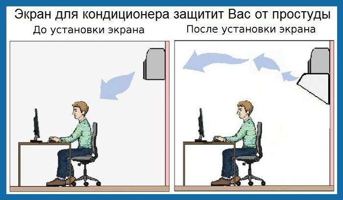 Le mauvais choix du lieu d'installation de l'unité intérieure est un facteur qui provoque des problèmes de santé. Si le flux d'air conditionné est dirigé vers la zone de travail ou de sommeil, l'hypothermie du corps s'installe rapidement. Les maladies virales et infectieuses suivent. Vous devez adopter une approche responsable lors de l'installation d'un système split, choisir des modèles avec des stores réglables, assurant une répartition uniforme du froid. Lors de l'installation, tenez compte du fait que dans une zone de 2 à 3 mètres de l'équipement, la vitesse de l'air est plus élevée et la température est plus basse que dans le reste de la pièce.