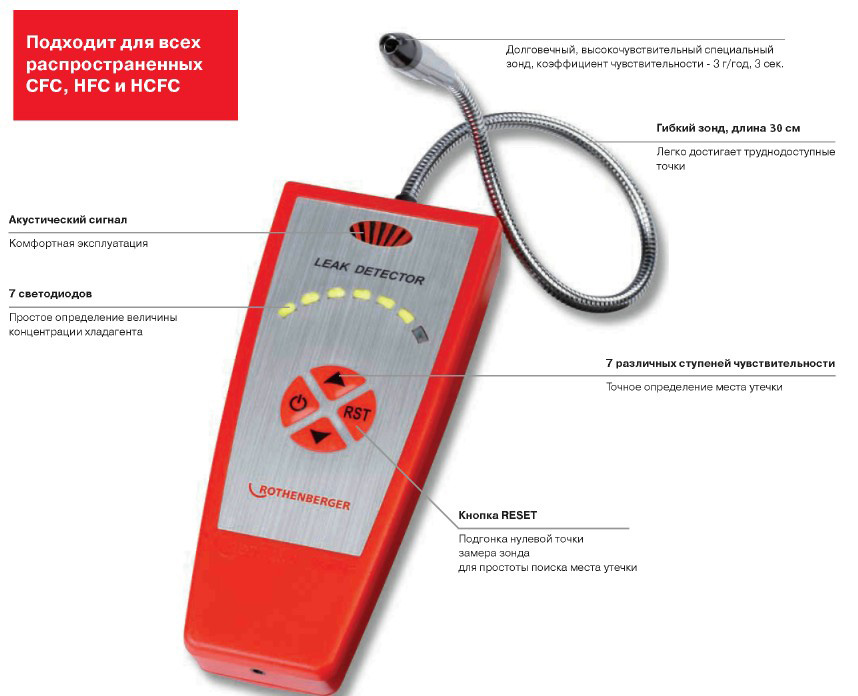Une fuite de réfrigérant dans le système de climatisation entraîne une diminution de la capacité de refroidissement. Un détecteur de fuite de fréon portable est utilisé pour trouver le problème. Le dispositif électronique est capable de détecter de petites pertes de l'ordre de 4 à 5 g/an. Il se compose d'un boîtier ergonomique avec un écran et d'une sonde flexible avec un capteur. L'emplacement de la fuite est indiqué par un signal acoustique et LED. Inconvénients d'un détecteur de fuite électronique :