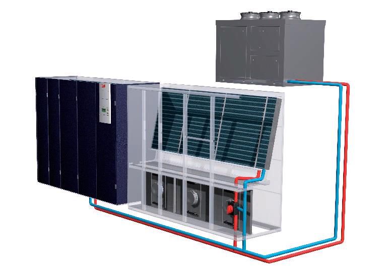 Pour les climatiseurs de précision à double circuit, un principe de fonctionnement différent est caractéristique, dans lequel l'air des serveurs pénètre dans l'évaporateur de l'unité intérieure du climatiseur de précision et y est refroidi, de là, il pénètre déjà dans la pièce. La charge calorifique ainsi évacuée est transférée vers un condenseur intégré dans le boîtier interne de l'appareil et refroidi à l'eau, puis rejetée dans le circuit d'eau. De là, la chaleur est libérée avec un refroidisseur sec et rejetée dans l'atmosphère.