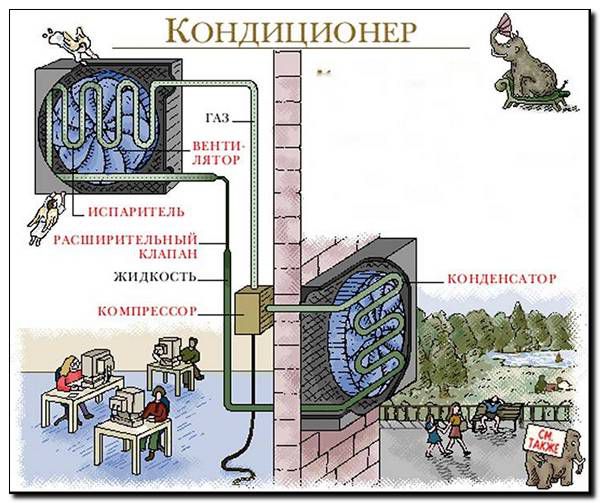 Lorsque la température de transition de phase est inférieure à la température ambiante, le réfrigérant se transforme en vapeur - il bout simplement et prend la chaleur de l'air. Si la température de transition de phase est supérieure aux valeurs de température de l'air, le fréon est converti en gaz, auquel il restitue de la chaleur à l'environnement. L'interaction avec l'air passe par des échangeurs de chaleur - un évaporateur sur l'unité intérieure et un condenseur à l'extérieur.