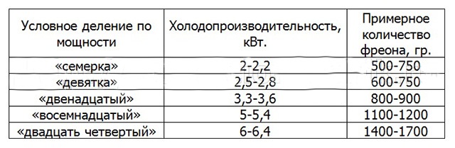 En usine, l'équipement est chargé de réfrigérant en fonction de la longueur du parcours de 3 à 5 mètres, le parcours doit donc être posé sur au moins 3 mètres, s'il est plus long que 5, l'unité doit être remplie. En moyenne, environ 15 grammes de fréon tombent sur un mètre de piste. Le fabricant annonce la quantité de fréon contenue dans le climatiseur à l'aide du tableau d'informations sur le boîtier. Dans les modèles les plus faibles, il peut atteindre 90 grammes, dans les systèmes split puissants jusqu'à 600 grammes.