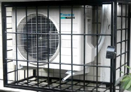 Le panier anti-vandalisme du climatiseur est un cadre métallique recouvert d'une grille sur tous les côtés. Il y a un accès sous la forme d'une porte sur le châssis avec une serrure - suspendue ou intégrée. La protection complète comprend l'installation d'une alarme qui émet un son que le gardien ou le responsable doit appeler à l'aide.