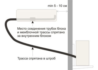 C'est l'option la plus difficile, mais pratique - seul le panneau décoratif en plastique de l'unité intérieure sera visible. Tous les tuyaux y pénètrent par l'arrière, ils ne sont pas visibles et l'aspect esthétique de la pièce est préservé. Le drainage est également caché, l'eau ne coule pas sur la tête des passants.