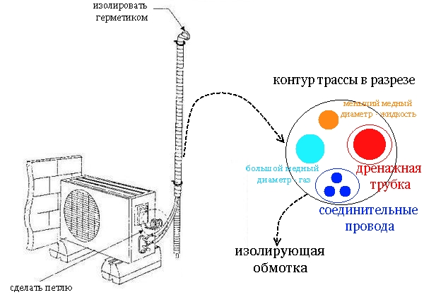 - Le tuyau est posé dans une rainure avec les tubes de fréon. Dans ce cas, le tracé s'effectue sous une pente naturelle vers l'évacuation des condensats accumulés.