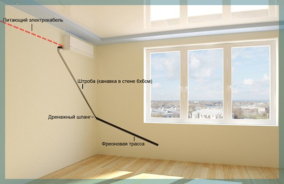 - Le drainage est effectué séparément de l'itinéraire principal - dans un tel cas, une pente explicite est créée uniquement pour le tuyau de drainage. Les tuyaux de fréon peuvent être posés à niveau. Ils sont souvent maintenus le long du plafond.