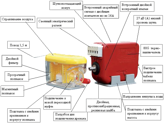 Toutes les pompes de drainage, quel que soit leur type, fonctionnent de la même manière: en accumulant les condensats, le flotteur monte, atteignant un certain niveau, ferme les contacts qui entraînent la pompe. La pompe pompe le liquide accumulé jusqu'à ce que le flotteur se mette en place et ouvre le circuit de commande électrique.