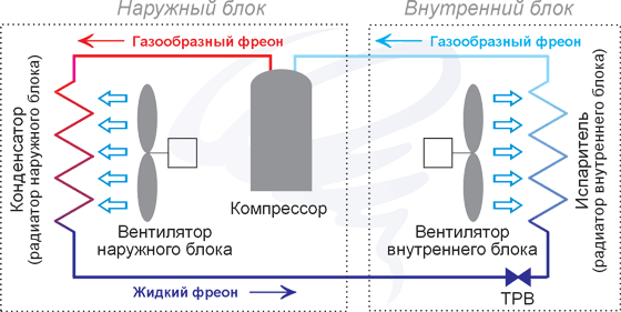 Une fois dans l'évaporateur, le fréon revient à l'état gazeux lorsqu'il interagit avec l'air ambiant, refroidissant l'espace de la pièce. La circulation a lieu grâce au fonctionnement du ventilateur.