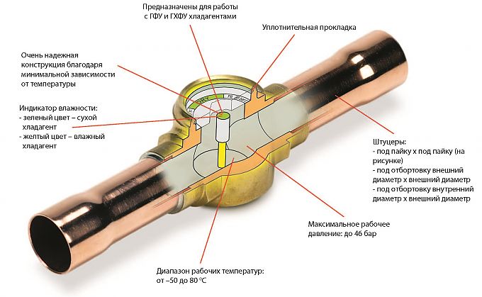 L'installation d'un indicateur d'humidité avec voyant permet de surveiller l'état du filtre sécheur d'un compresseur de climatisation. La couleur de l'appareil est utilisée pour déterminer la teneur en humidité du réfrigérant. Les barres vertes indiquent normal. Une coloration jaune et l'apparition de bulles dans la fenêtre de visualisation indiquent un colmatage et une diminution de l'efficacité de l'appareil. C'est l'une des raisons du remplacement du filtre déshydrateur. Le détail change dans d'autres cas :