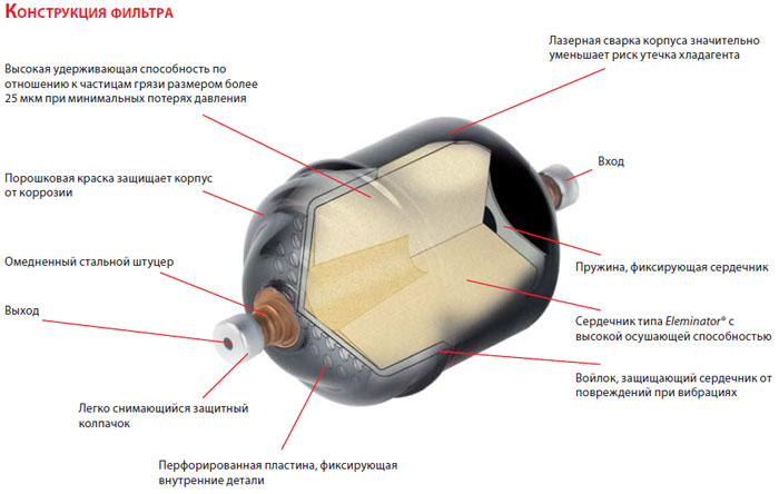 Dans certains modèles, un tuyau supplémentaire est installé à l'entrée.Il est utilisé pour évacuer le système. Une face de l'âme vient en butée contre la plaque perforée et l'insert anti-vibration. La partie de retour est fixée avec un ressort. Un grillage est installé à l'entrée pour empêcher les granules de zéolite d'entrer dans le condenseur. Le diamètre des particules adsorbantes est de 1,5 à 3 mm. A la sortie il y a une grille avec des cellules plus petites. Son but est de capturer les solides du fréon.