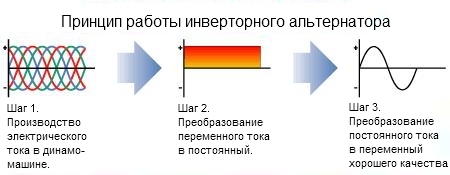 Tout d'abord, un courant continu est généré en raison de la tension alternative du secteur. Ensuite, un courant alternatif de la fréquence requise est formé à partir de la tension constante résultante.