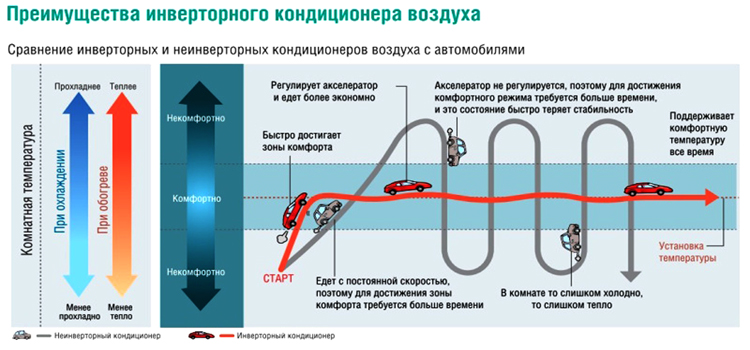 - installation rapide du mode préréglé : les autres modèles ont besoin d'environ une demi-heure pour commencer à maintenir la température réglée ; les moteurs à onduleur raccourcissent ce processus à 15 minutes.
