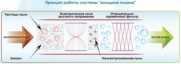 Le principe de fonctionnement du filtre à plasma repose sur l'effet de la haute tension sur les organismes vivants qui y pénètrent : spores de champignons, microbes et virus, ainsi que pollen de plantes. Des suspensions plus grosses sont déposées sur le filtre photocatalytique précédant celui à plasma.