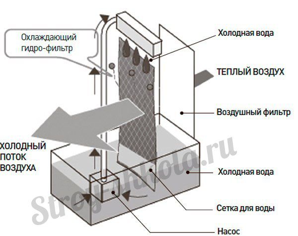 Le principe de fonctionnement est que le refroidissement est dû à l'évaporation. En fait, la même transition de phase est utilisée ici - l'eau passe d'un état liquide à un état gazeux et absorbe de la chaleur. L'avantage est que l'appareil n'émet pas une grande quantité d'énergie thermique dans ce processus, par conséquent, il n'est pas nécessaire d'installer les tuyaux de sortie et le condensat ne s'accumule pas, car il pénètre dans la pièce avec de l'air, l'humidifiant.