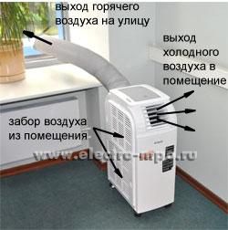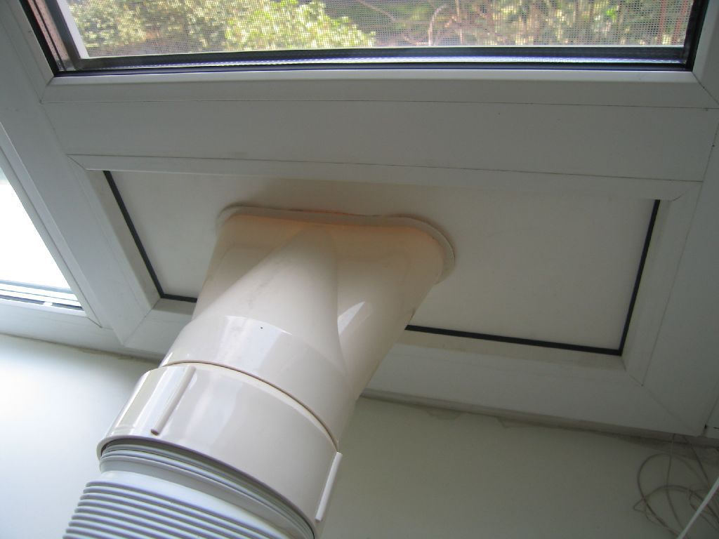 Le principe de fonctionnement d'un tel appareil est que l'air prélevé dans la pièce est divisé en flux chauds et froids. Le premier entre dans la pièce et l'air chaud qui refroidit le condenseur est rejeté dans la rue par le tuyau ondulé. Habituellement, le tuyau du dissipateur de chaleur passe à travers une fenêtre ou un trou spécial au bas du vantail de la fenêtre (avec des fenêtres en plastique à double vitrage). Dans la cuisine, il peut être retiré par le conduit de ventilation. Parfois, il est permis de faire passer un manchon de tuyau dans un trou technique du plafond mural.