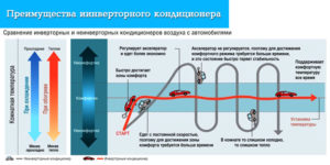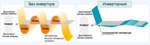 Ainsi, on peut noter deux caractéristiques du climatiseur inverter qui pousseront les acheteurs à choisir ce modèle.La première est une approche moderne de la mise en œuvre de nouvelles solutions en matière d'économie d'énergie. La seconde est une tension constante dans le réseau, qui gardera intacts les autres appareils ménagers et lampes.