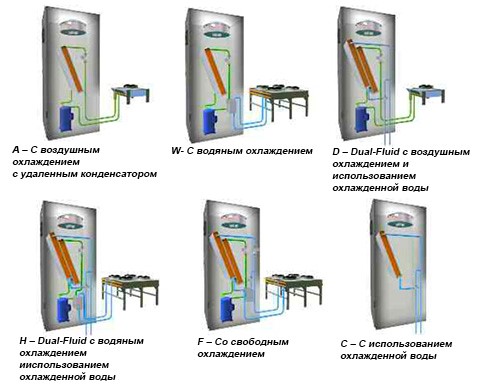 Les complexes climatiques peuvent être monoblocs et séparés selon le type de systèmes split. Le système est refroidi de diverses manières : par évaporation de fréon, par circuit d'eau ou d'air. Fabricants populaires : UNIFLAIR, Boîte bleue.