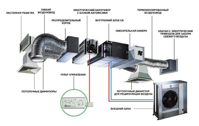 La principale caractéristique du système climatique de type conduit est la répartition des flux à travers les conduits d'air. Le climatiseur se compose d'une unité intérieure et d'une unité extérieure, entre lesquelles le réfrigérant circule en circuit fermé. Le module intérieur est équipé d'un puissant ventilateur pour surmonter la traînée aérodynamique dans les conduits d'air. L'installation dissimulée des équipements ne perturbe pas l'intérieur des locaux. Les appareils et les conduits d'air sont cachés sous le faux plafond.