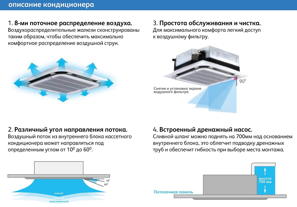 Les équipements climatiques de type cassette sont destinés à desservir des locaux jusqu'à 200 m2.