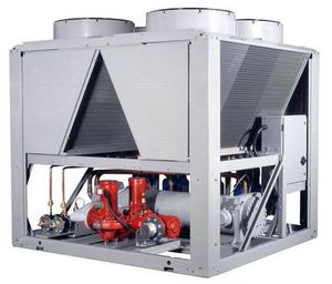 - installation extérieure avec refroidissement par air : l'échangeur-condenseur est refroidi au moyen de ventilateurs axiaux ;