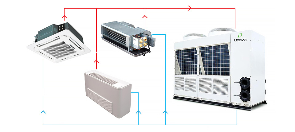 Le système refroidisseur-ventilo-convecteur est principalement utilisé dans les cas où la superficie des locaux et les caractéristiques du bâtiment ne permettent pas d'utiliser le système split comme équipement climatique.