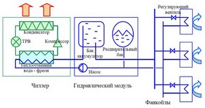 Un refroidisseur sert de dispositif de refroidissement. C'est une unité externe qui produit et fournit du froid à travers un ensemble de canalisations, à l'intérieur desquelles circule de l'éthylène glycol ou de l'eau. C'est la différence fondamentale avec les systèmes split, où le fréon agit comme un réfrigérant, dont le transfert s'effectue par des tuyaux en cuivre coûteux.