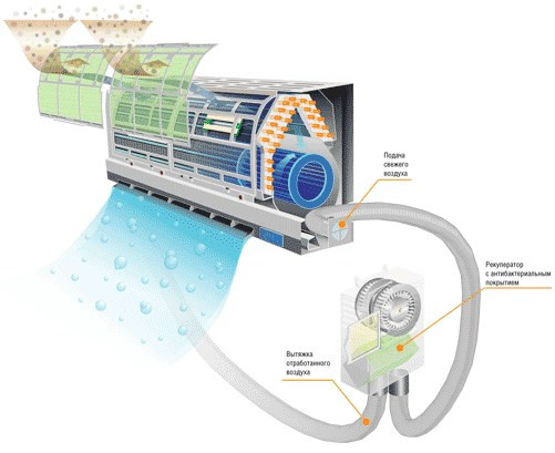 Pour assurer une ventilation complète des locaux, en remplaçant l'air évacué par de l'air frais, seuls les systèmes d'alimentation sont capables, qui, par leur principe de fonctionnement, sont similaires aux systèmes split conventionnels, mais diffèrent quelque peu d'eux par leur conception et leur méthode d'installation. Ils sont construits sur la base de climatiseurs à recirculation d'air et sont capables de fournir jusqu'à 160 mètres cubes aux locaux. m d'air par heure.
