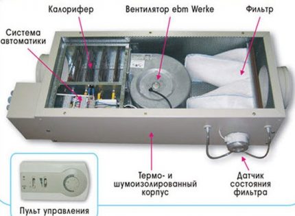 - unité intérieure, qui comprend un ventilateur, un échangeur de chaleur avec un ventilateur, un filtre et un module de commande ; un chauffage supplémentaire est connecté à l'unité, réalisé dans un boîtier séparé;