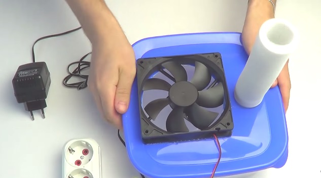 - Découpez un trou avec un couteau dans le couvercle du récipient en plastique pour s'adapter à la glacière, fixez avec de petites vis et scellez avec de la colle silicone pour que l'air ne s'échappe pas. Si 2 ventilateurs sont utilisés, l'un est superposé à l'autre et fixé par des vis. Il est plus facile d'installer un audite puissant, le refroidissement sera plus fort.