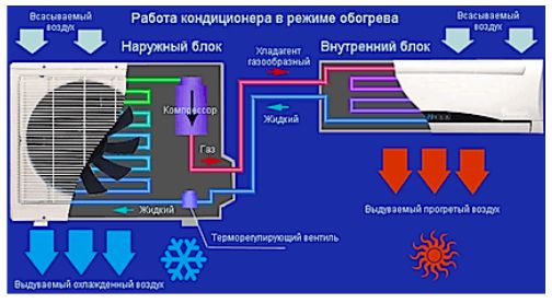La plupart des fentes peuvent produire de l'air chaud. De manière générale, ce processus peut être appelé l'inverse du fréon, dans lequel le compresseur est chargé de le pomper vers la pièce : la chaleur est prélevée à l'extérieur et transportée à l'intérieur. La modification de la course du réfrigérant nécessite une vanne à quatre voies qui permute les positions de l'évaporateur et du condenseur. La condensation de fréon se produit dans l'unité intérieure avec dégagement de chaleur, et dans l'unité extérieure, il se produit une évaporation, au cours de laquelle le climatiseur absorbe de la chaleur. La chaleur est pompée d'un endroit à un autre, mais n'est pas générée. De ce fait, en mode chauffage, l'efficacité du climatiseur est considérablement réduite, ce qui le rend inefficace à des températures de rue plus proches du zéro.