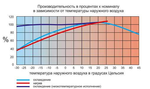 Si la puissance thermique est de 3,5 kW et la consommation de 1,2 kW, le rendement sera d'environ 2,9 kW. Ceci est considéré comme une performance assez élevée. Si la température extérieure baisse, la consommation d'énergie augmente en conséquence et le coefficient baisse sensiblement. Un ratio inférieur à 2,4 est considéré comme faible. Les appareils avec de telles valeurs sont étiquetés en dessous de la classe A.