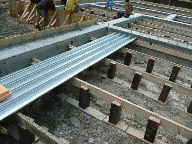 Dans le cas général, lors de la disposition d'un sol monolithique sur une tôle profilée, le rôle de coffrage fixe est joué par un sol profilé, sur lequel le mortier est posé. Dans ce cas, le chevauchement repose sur une structure métallique de support, et son poids est uniformément réparti entre les éléments de support du cadre. Grâce à cela, des coquillages, des blocs de gaz et d'autres matériaux légers peuvent être utilisés pour la construction de murs.