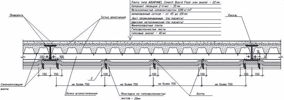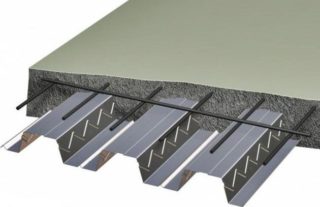 Sur la base de la charge de fonctionnement, la section transversale des poutres est déterminée. Le béton armé et les tôles profilées sont reliés par des tiges d'ancrage verticales, ce qui permet à ces derniers de transférer une partie de la charge. Dans le même temps, pour une portée de trois mètres, vous aurez besoin d'une tôle profilée d'une épaisseur d'au moins 0,9 mm.
